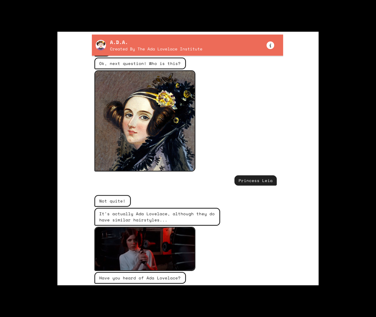As the Ada Lovelace Institute was a fairly new organisation at the time, the challenge was on how to build something engaging, while ensuring the serious work the institute conducts is communicated clearly through the A.D.A bot experience.