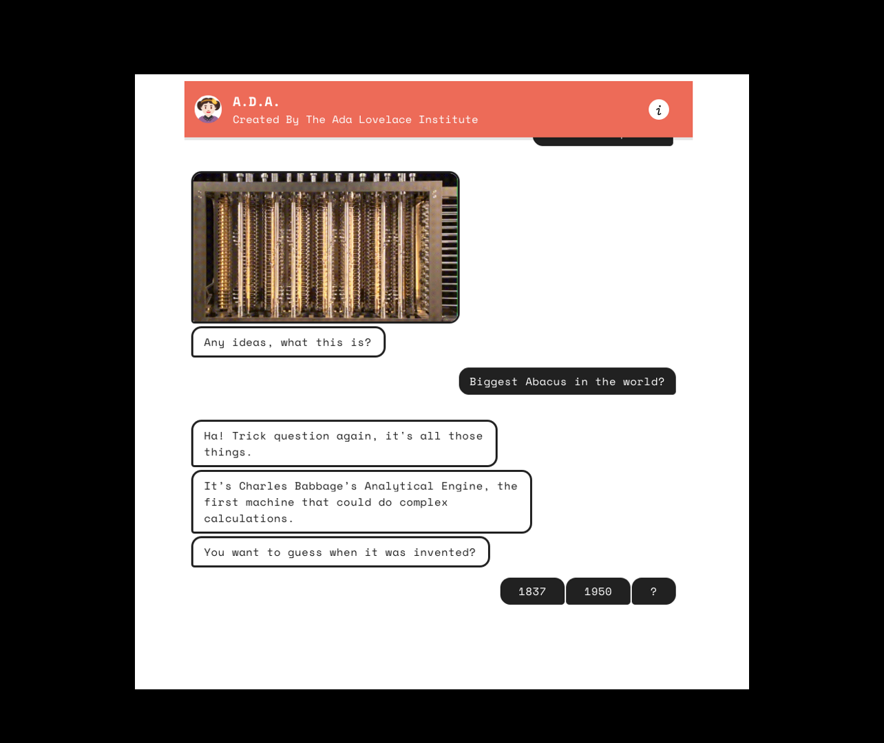 For Ada Lovelace Day on 8 October 2019, the Ada Lovelace Institute (ALI) commissioned COMUZI to create the A.D.A. (the Algorithms, Data and AI) Bot as an engagement tool to raise awareness of the Institute and its work.